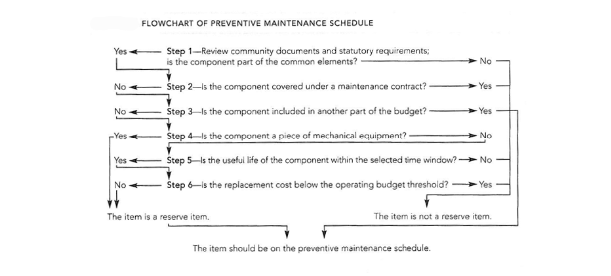 Communities interested in developing a preventive maintenance schedule should contact a community association engineering firm or a reserve study company. These professionals can help prepare a maintenance schedule as part of the community’s budgeting process. Preventive maintenance schedules are generally prepared at the same time as a community’s reserve study. The reserve preparer and/or Reserve Specialist (RS™) will assess the common elements of the community and determine which components will require regular or preventive maintenance.